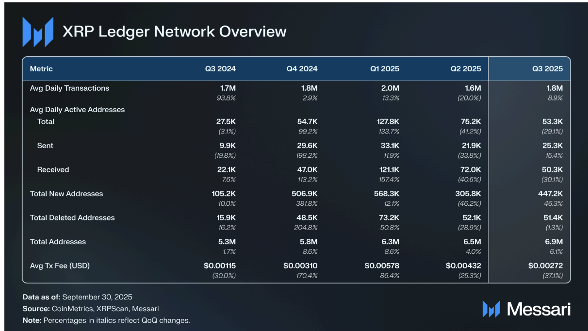 Messari also highlighted an 8.9% QoQ increase in Q3 in the average daily transactions on the XRP Ledger (XRPL) from 1.6 million to 1.8 million. Daily active addresses rose by 15.4% QoQ from 21,900 to 25,300, while the total number of new addresses rose 46.3% to 447,200.