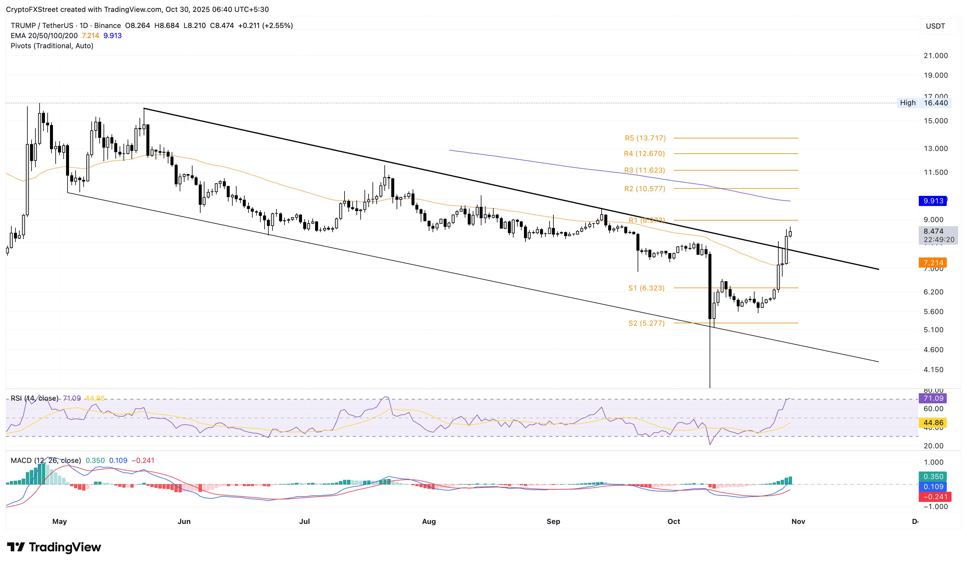 The Official Trump token edges higher by over 2% at press time on Thursday, extending the 15% gains from Wednesday. The official meme coin of the US President Donald Trump breaks out of a falling channel pattern on the daily chart, aiming for the R1 Pivot Point at $8.973.