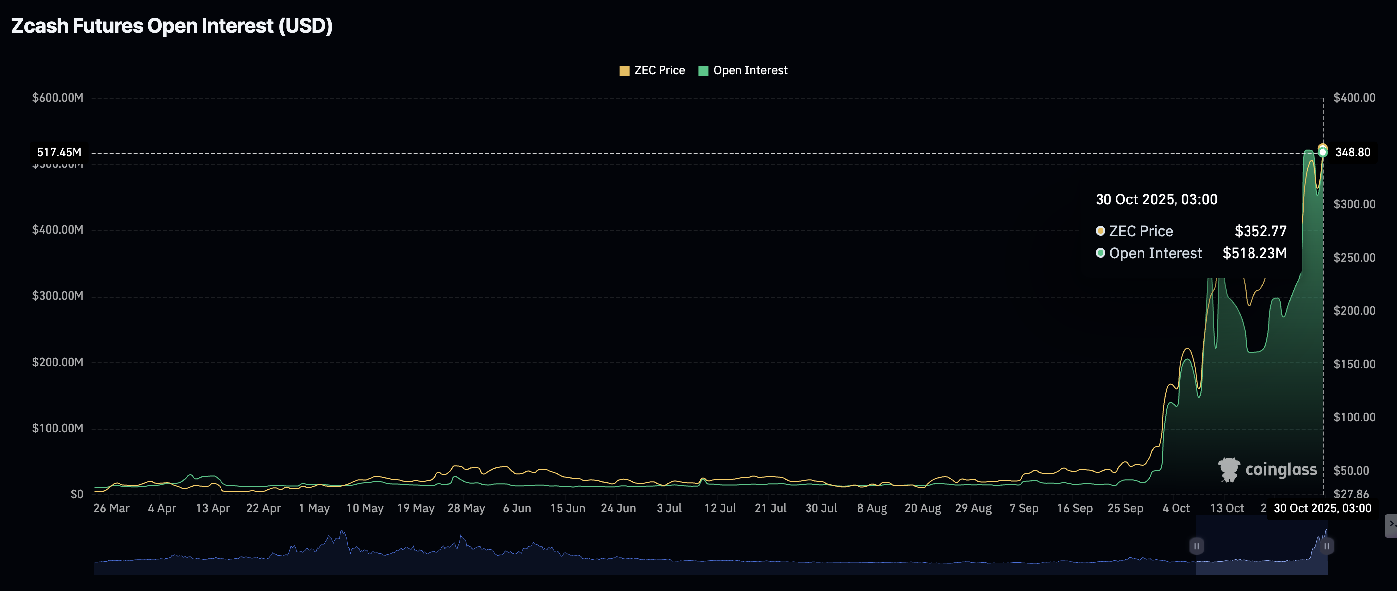 Zcash showcases one of the strongest short-term derivatives markets, with futures Open Interest (OI) holding around $518 million on Thursday after hitting a record high of $521 million on Monday.