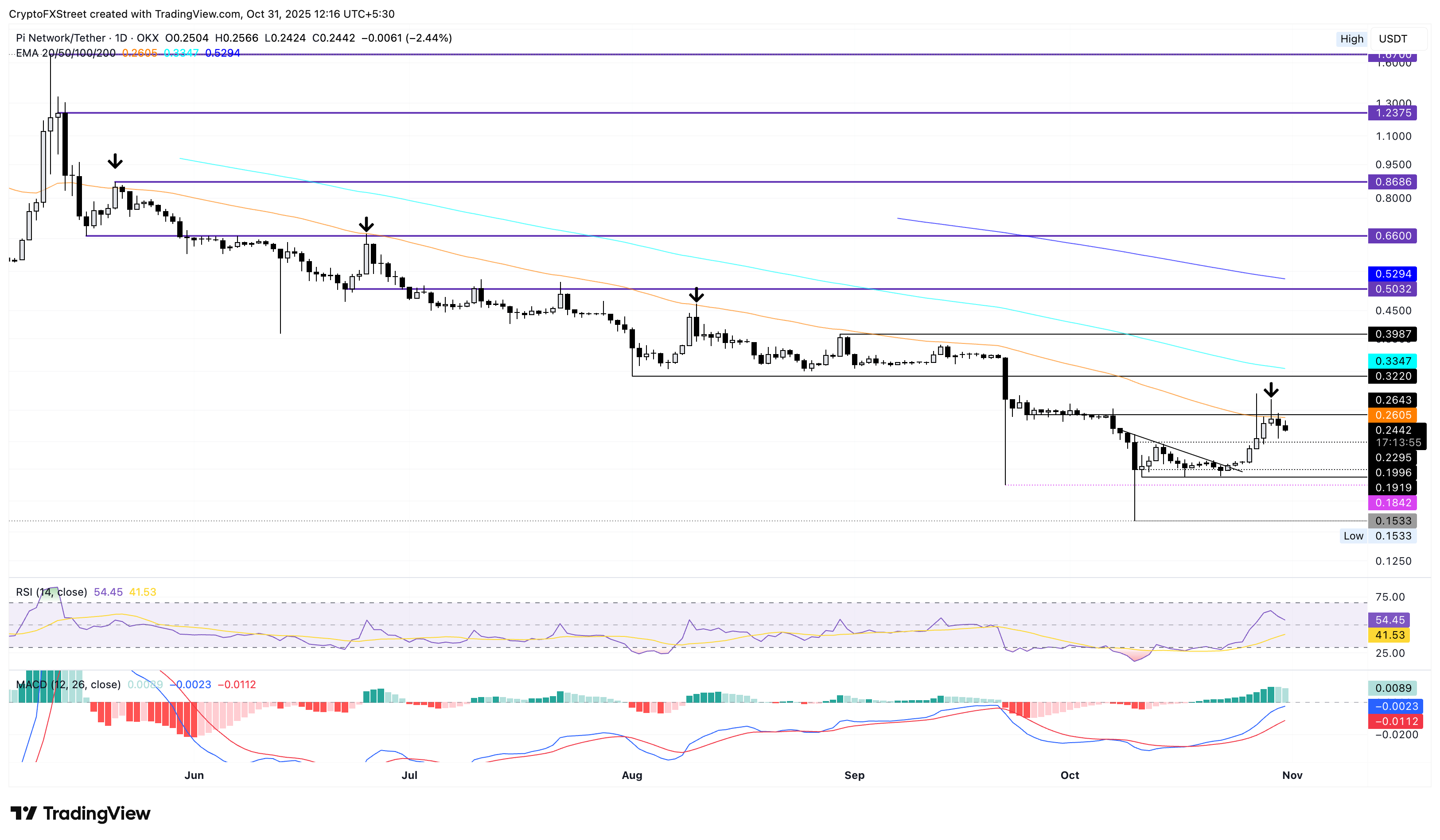 Pi Network’s fourth reversal from this average line, acting as a crucial dynamic resistance that has remained intact since May, risks erasing the gains made earlier this week. The immediate support for PI lies at the $0.2000 round figure and the $0.1919 level, marked by the October 11 low.