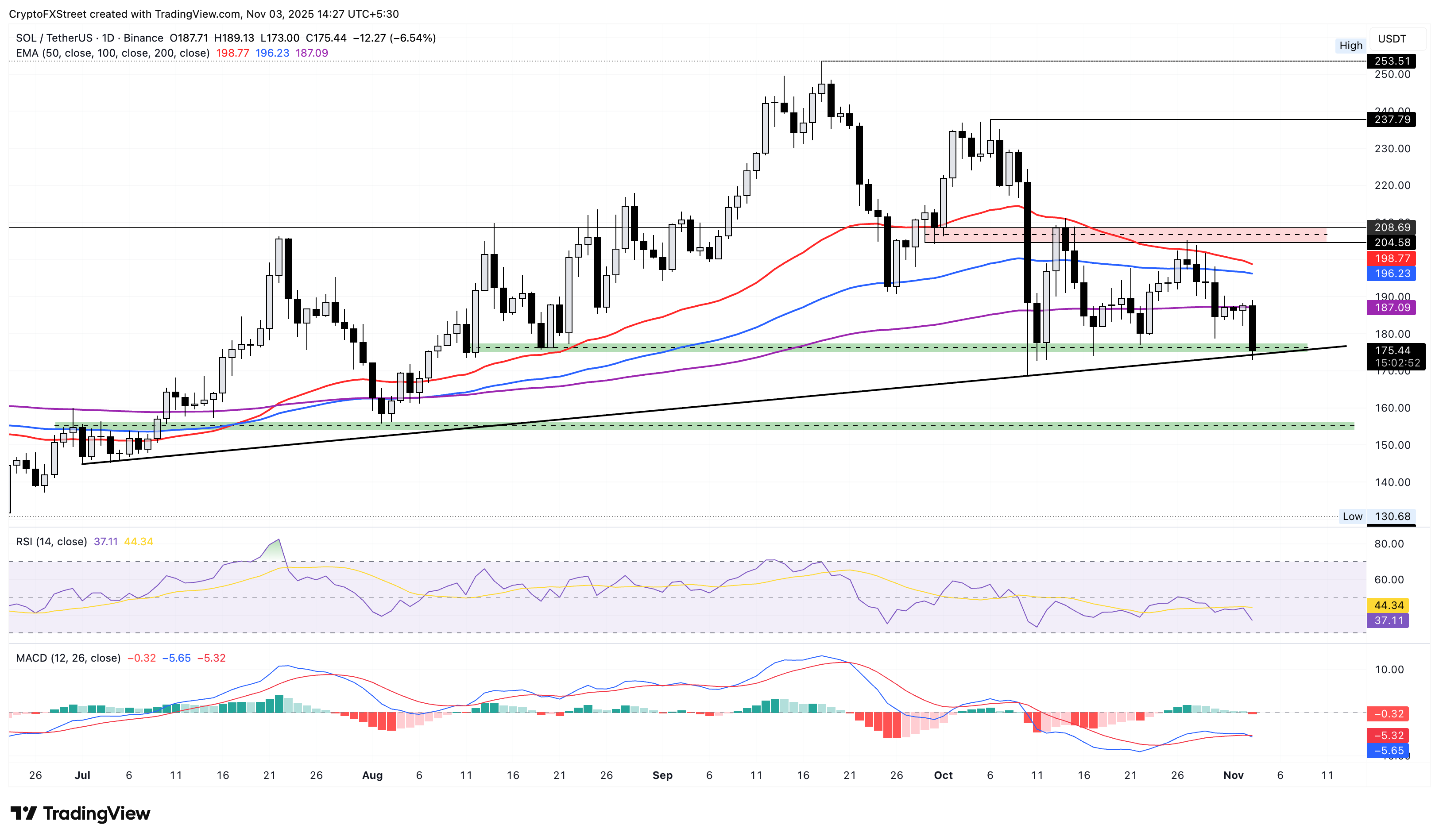 Solana trades at $175 by press time on Monday, after an over 6% intraday loss, risking the $174-$177 demand zone and a support trendline formed by connecting the July 1 and October 10 lows.
