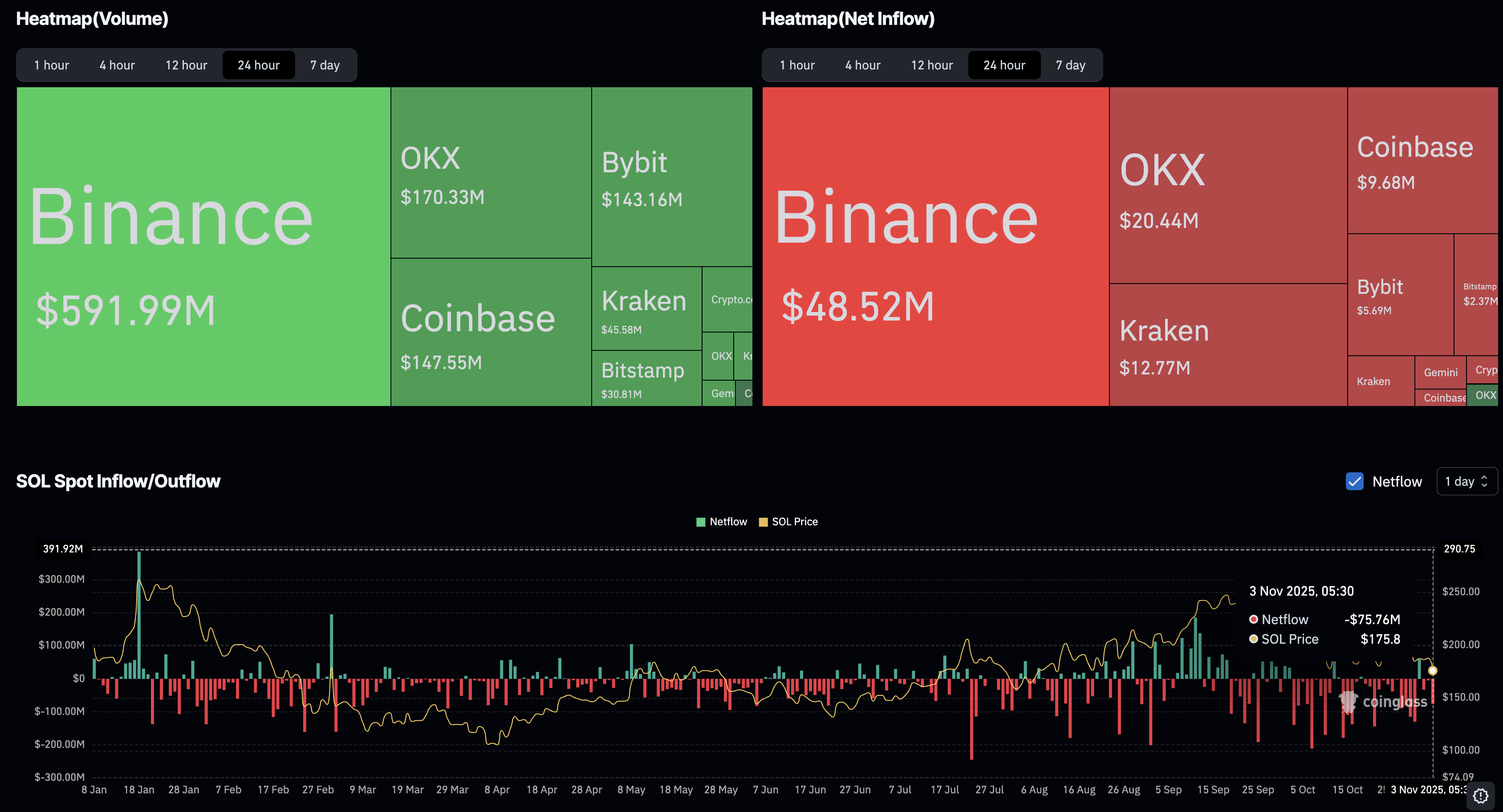 Adding more buffer, the intraday netflows in the spot market show a net outflow of $75.76 million worth of Solana so far on Monday. This indicates that traders are either capitalizing on discounted prices or shifting tokens from exchanges to cold storage, reflecting confidence in Solana.