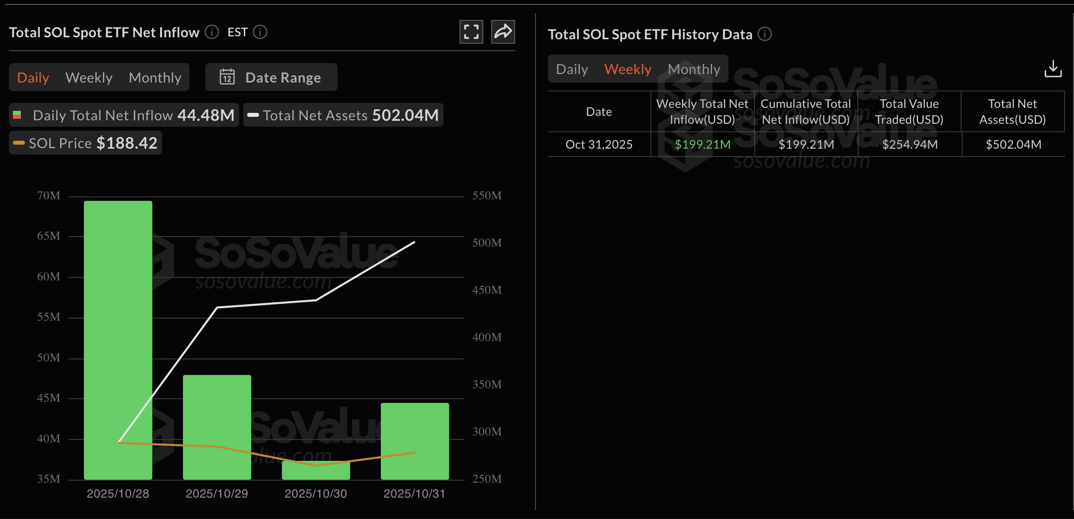 Despite the waning retail demand keeping SOL on the edge, the launch of the US spot Solana ETFs last week shows steady institutional demand for Ethereum’s top competitor. Sosovalue data shows four consecutive days of inflows last week, amounting to $199.21 million for the week ending October 31. If the steady trend continues this week, demand from institutional players could lift SOL prices.