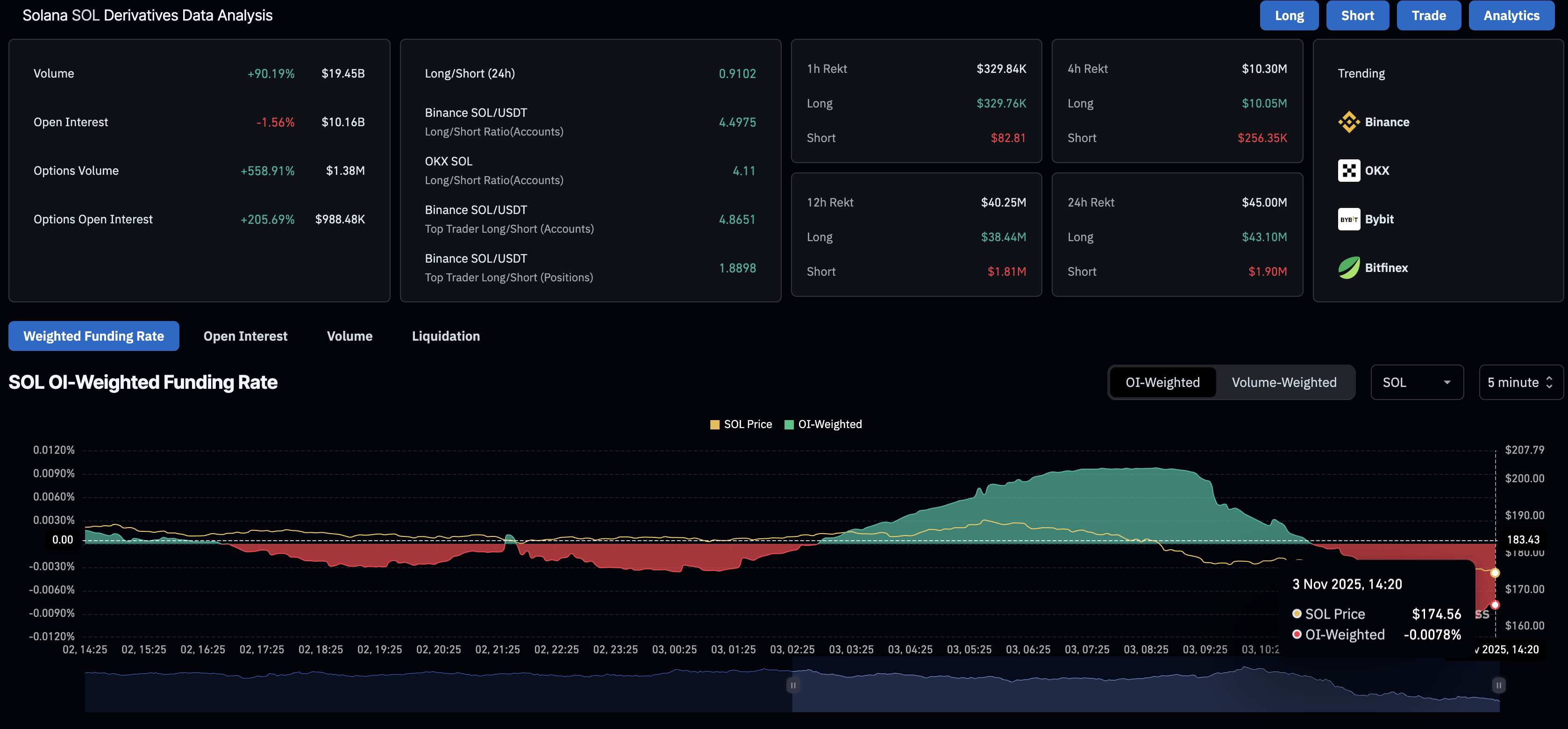 Solana (SOL) price is down over 6% at press time on Monday, pressuring the $174-$177 support zone after reversing from the 200-day Exponential Moving Average (EMA). The derivatives data suggest a bearish incline among traders anticipating further losses.