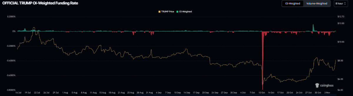 Derivatives data also support a bullish bias. Coinglass’s OI-Weighted Funding Rate data shows that the number of traders betting that the price of TRUMP memecoin will slide further is lower than those anticipating a price increase.