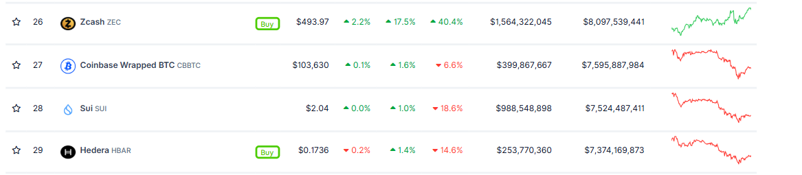 Zcash soared more than 17% so far this week and is nearing the $500 mark at the time of writing on Thursday. CoinGecko data shows that ZEC’s market capitalization has surged above $8 billion, putting it in the 26th spot in the overall crypto market and surpassing popular altcoins such as SUI and HBAR.