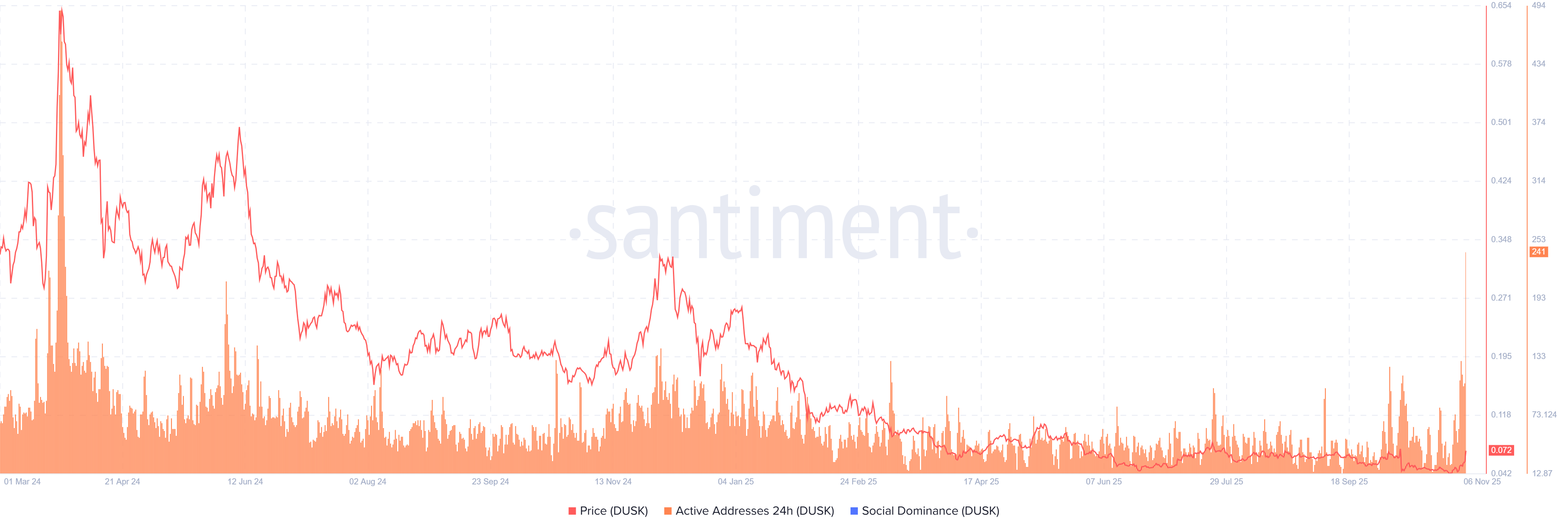 DUSK (DUSK) price continues its strong upward momentum, trading above $0.078 at the time of writing on Friday, extending gains of over 60% so far this week. On-chain data shows a sharp rise in daily active addresses and network growth, reaching levels not seen in 20 months, signaling renewed investor interest. Meanwhile, bullish technical indicators suggest DUSK is set for another leg higher, potentially targeting $0.10.