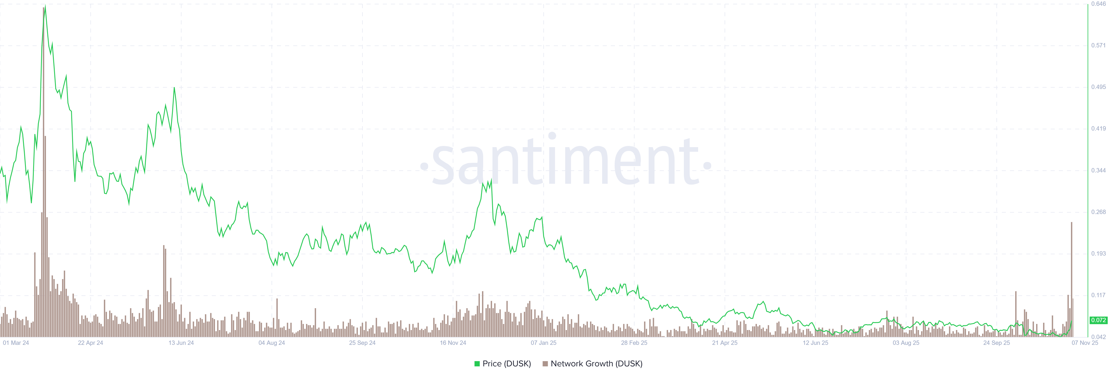 Santiment data show that DUSK’s network growth index — a key metric tracking user adoption and project traction — surged to 95 on Thursday from 13 on Monday, the highest level since March 2024. Although it has since stabilized around 32 on Friday, the elevated levels still highlight a broadly bullish outlook for DUSK.