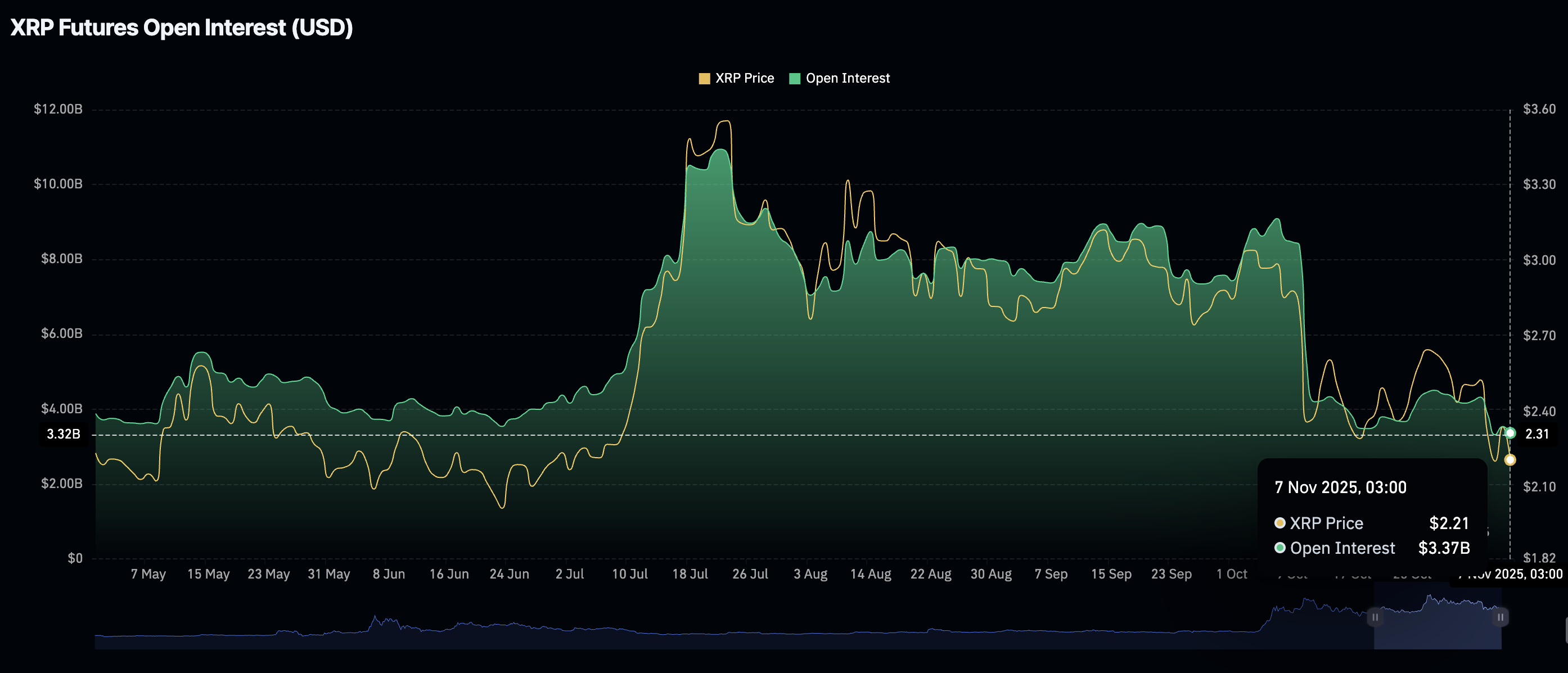 Meanwhile, retail demand for XRP remains significantly suppressed, with the futures OI holding at $3.37 billion on Thursday, down from $3.54 billion the previous day. The OI has decreased by 69% from its $10.94 billion peak in mid-July after the XRP price reached an all-time high of $3.66. Investors are not convinced that XRP can turn around and sustain a recovery in the short term.