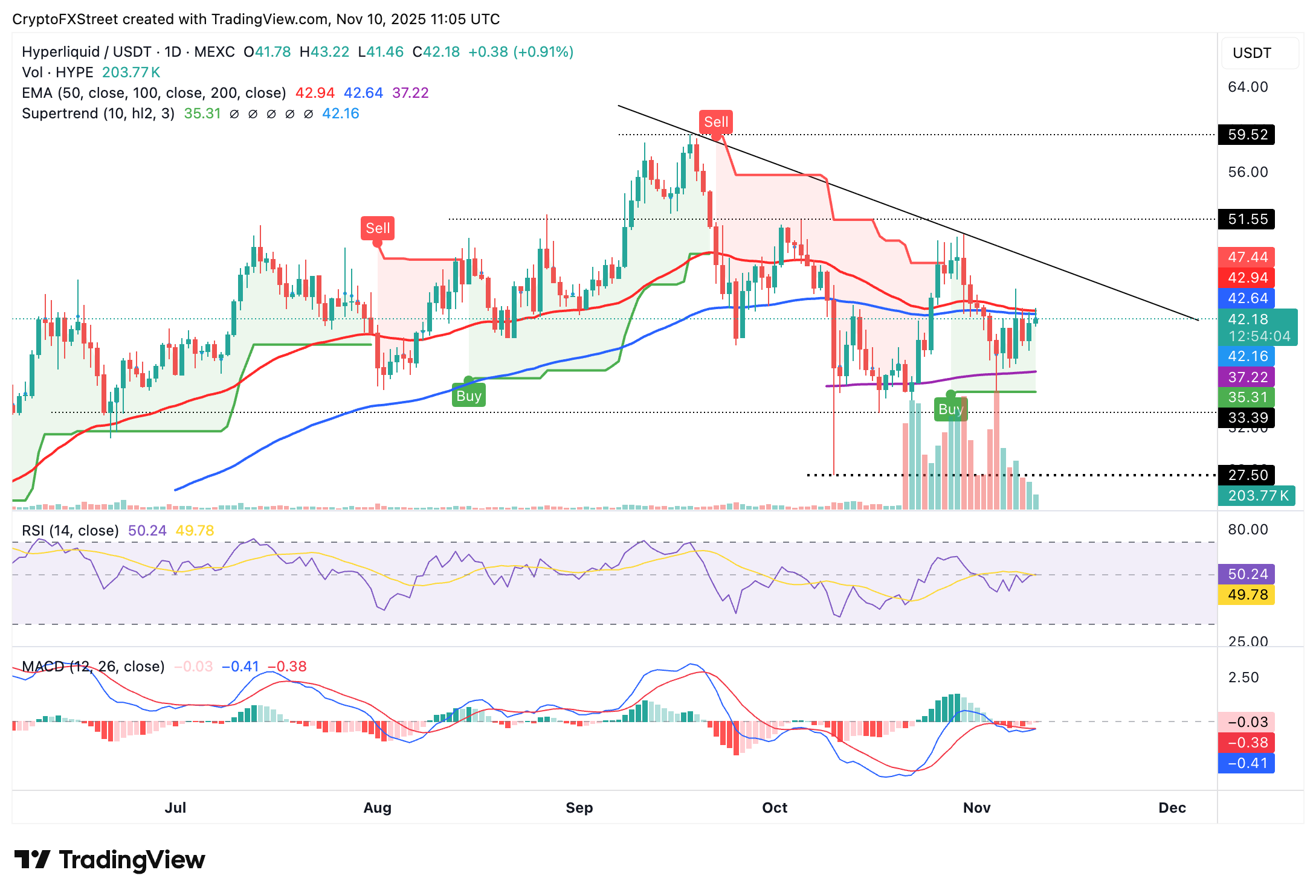 Technical analysis shows that bulls are slowly regaining control as Hyperliquid’s price rises alongside other cryptocurrencies. The token is trading marginally below the confluence of the 50-day and 100-day Exponential Moving Averages (EMAs) at around $42.64 at the time of writing on Monday.