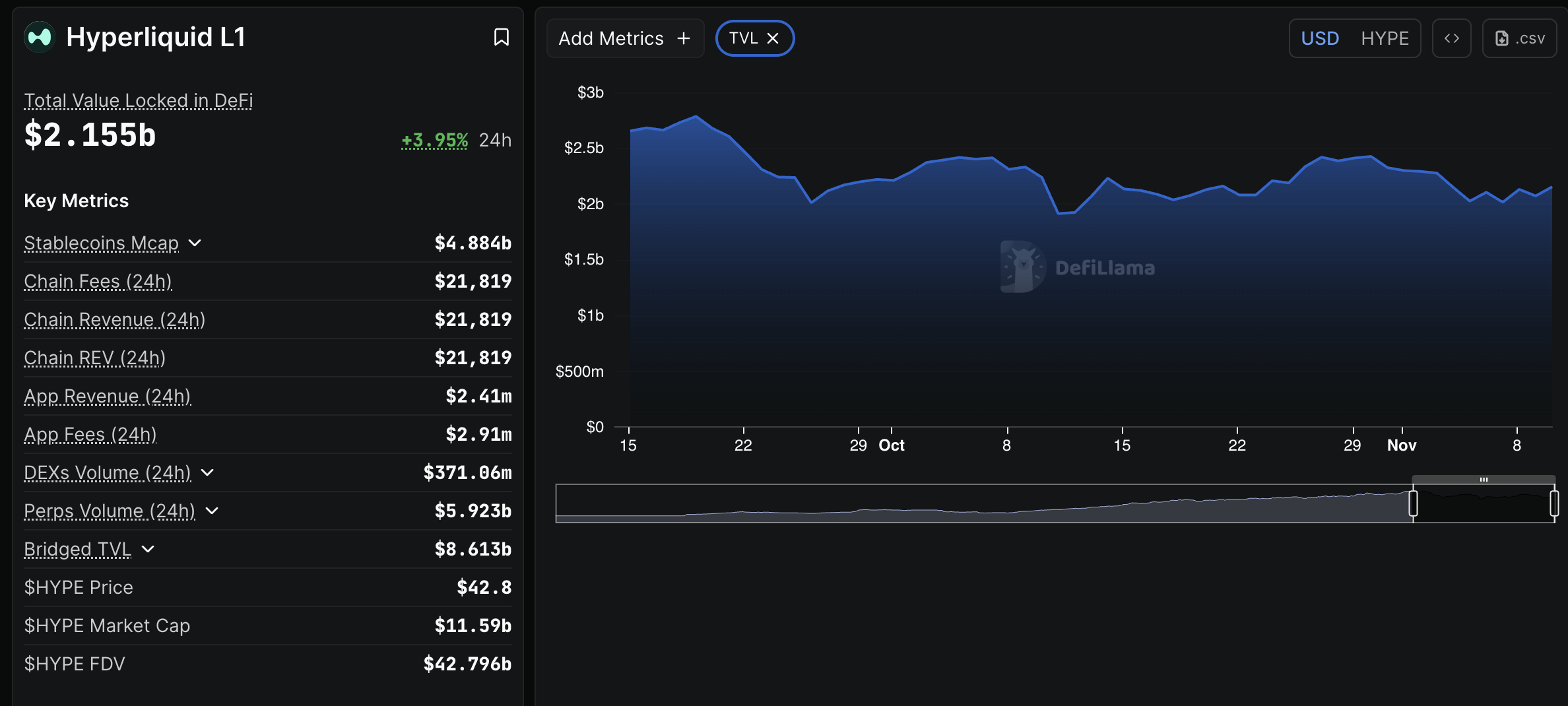 Hyperliquid’s Decentralized Finance (DeFi) Total Value Locked (TVL) is up by nearly 4% over the last 24 hours to $2.15 billion, according to DefiLlama.