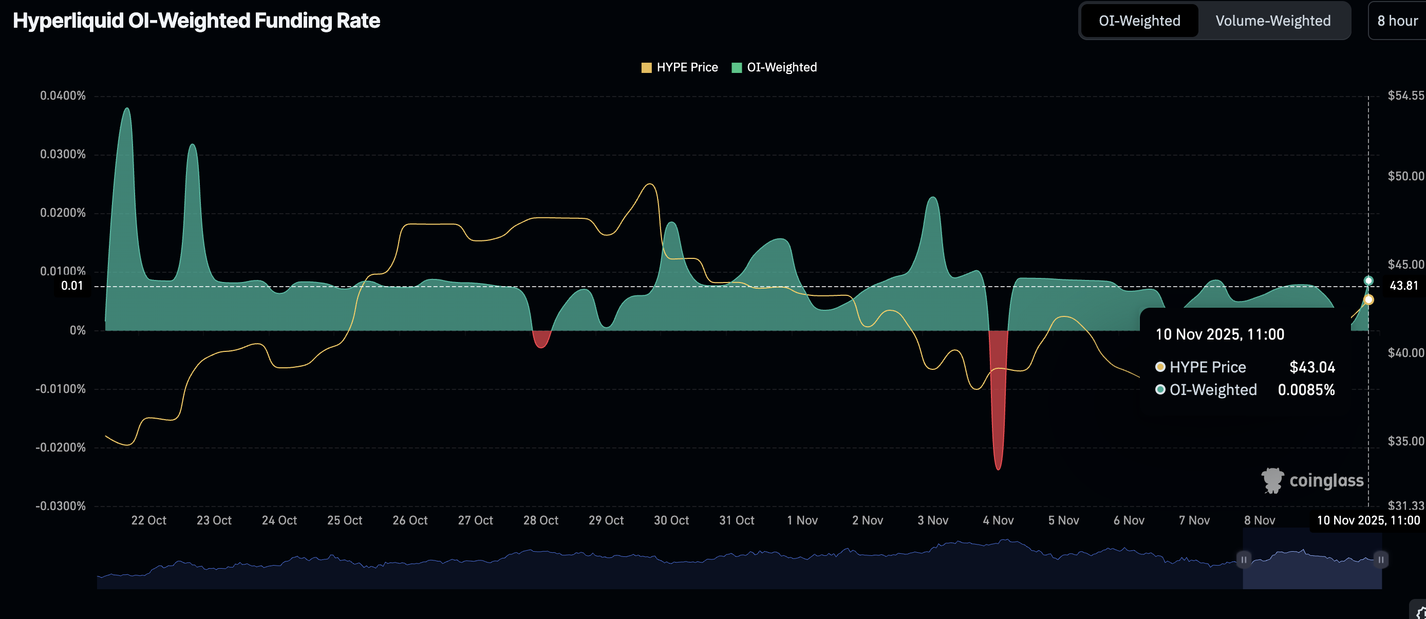 Traders are increasingly piling into Hyperliquid long positions, as evidenced by the Open Interest-Weighted Funding Rate metric’s lift to 0.0085% on Monday from 0.0060% the previous day. If risk-on sentiment steadies in the coming days, encouraging investors to increase their exposure, HYPE may sustain recovery, targeting highs above $50.00 in the short to medium term.