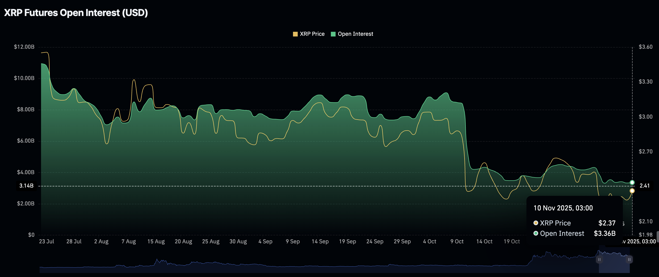 Meanwhile, retail demand for XRO remains relatively low, with the Open Interest (OI) averaging $3.36 billion on Monday compared to $4.17 billion on November 7 and $9 billion, the October peak level.
