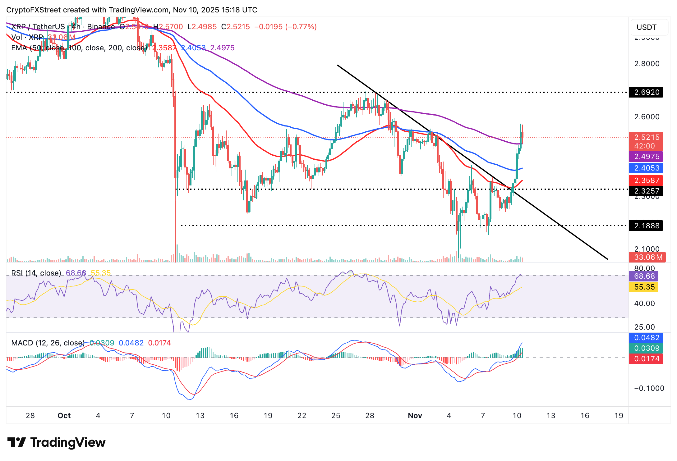 XRP is trading above $2.50 at the time of writing on Monday after its intraday uptrend was rejected at $2.57. The 200-period Exponential Moving Average (EMA) provides initial support at $2.49 on the 4-hour chart, which may come in handy if profit-taking continues to dampen recovery.