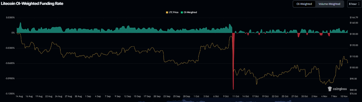 CoinGlass’s OI-Weighted Funding Rate data shows that the number of traders betting that the price of Litecoin will slide further is lower than that anticipating a price increase. The metric has flipped to a positive rate and currently reads 0.0055%, indicating that longs are paying shorts and suggesting bullish sentiment among traders.