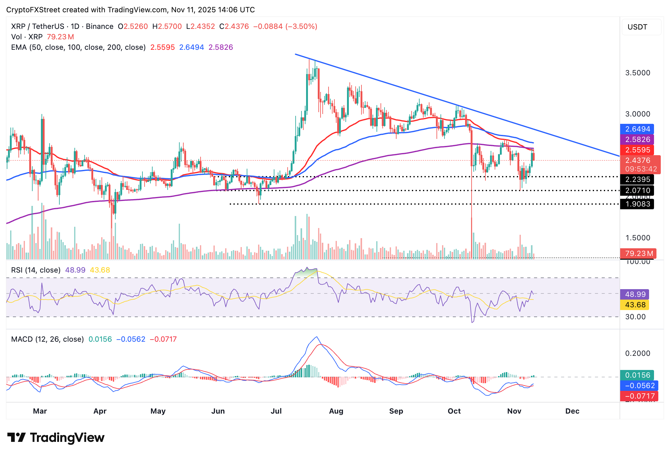 XRP edges lower, down nearly 3% to $2.45 at the time of writing on Tuesday. The cross-border remittance token is also positioned below key moving averages, including the 50-day EMA at $2.56, the 200-day EMA at $2.58, and the 100-day EMA at $2.64, all of which highlight key resistance levels.