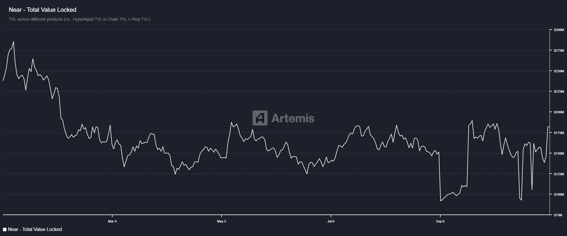 Arthemis Terminal data shows that NEAR TVL increased to $182.1 million on Wednesday, up from $105.5 million on October 29, and has been steadily rising since then. Rising TVL indicates growing activity and interest in NEAR Protocol’s ecosystem, suggesting that more users are depositing or using assets on NEAR-based protocols.