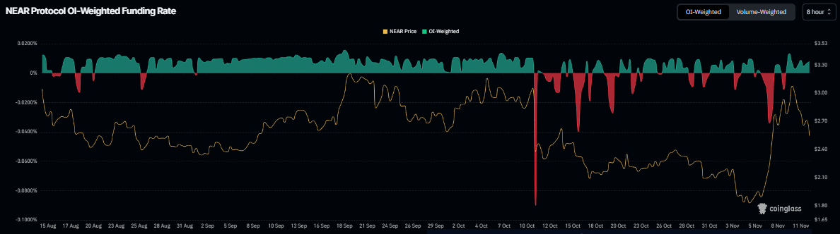On the derivatives side, NEAR appears poised for a recovery rally, as Coinglass’s OI-Weighted Funding Rate data shows that the number of traders betting that the price of NEAR Protocol will slide further is lower than those anticipating a price increase. The metric flipped to a positive rate on Sunday and stood at 0.0079% on Wednesday, indicating that longs are paying shorts and indicating a bullish sentiment.