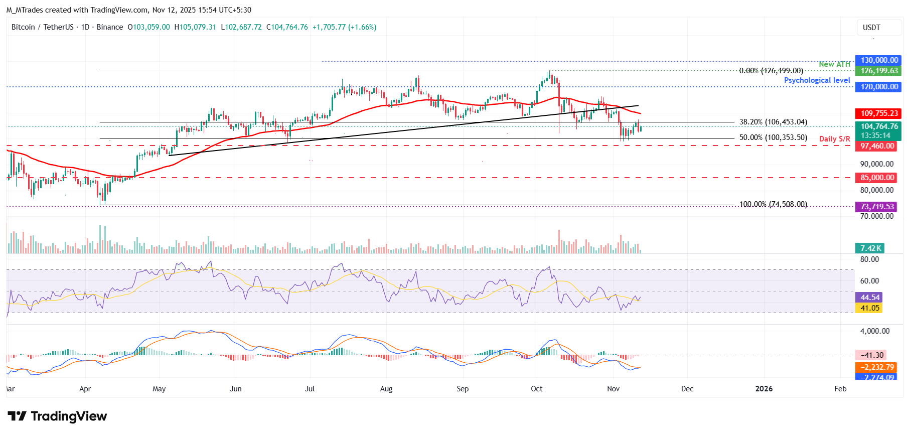 If BTC continues its recovery and closes above the 38.2% Fibonacci retracement at $106,453 on a daily basis, it could extend the rally toward the 50-day Exponential Moving Average (EMA) at $109,755.