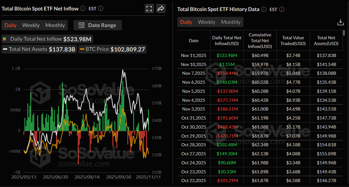 • US-listed spot Bitcoin ETFs saw a $523.98 million inflow on Tuesday, reflecting renewed institutional demand.