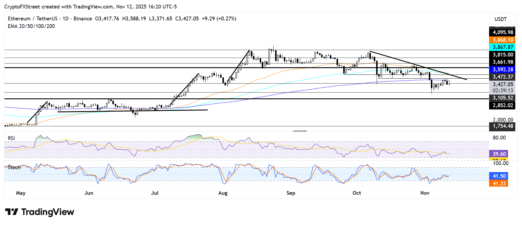 On the upside, if ETH rises above $3,660, it faces a descending trendline resistance near the confluence of the 50-day and 100-day EMAs.