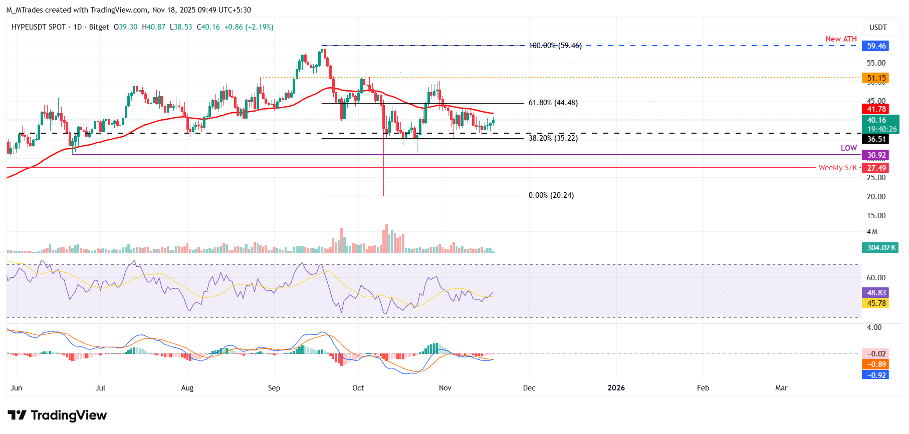 Hyperliquid's price rebounded after retesting the daily support at $36.51 on Friday, and it nearly rose by 5% over the next three days. At the time of writing on Tuesday, HYPE continues its gains, trading above $40.