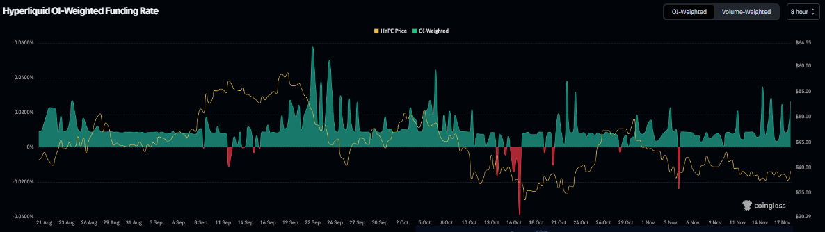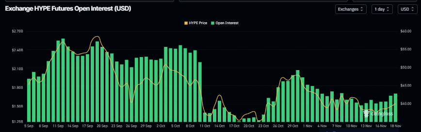 CoinGlass’ data shows that HYPE futures OI at exchanges rose to $1.71 billion on Tuesday, up from $1.52 billion on November 12, and has been rising steadily since then. Rising OI represents new or additional money entering the market and new buying, which could fuel the current HYPE price rally.