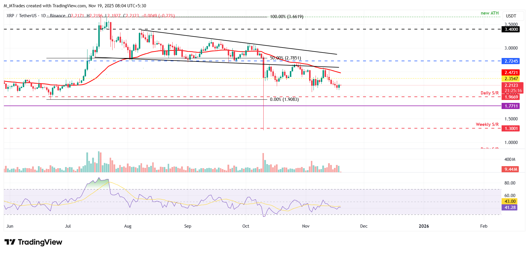 • XRP steadies around $2.23, pausing after a 6% correction in the previous week.