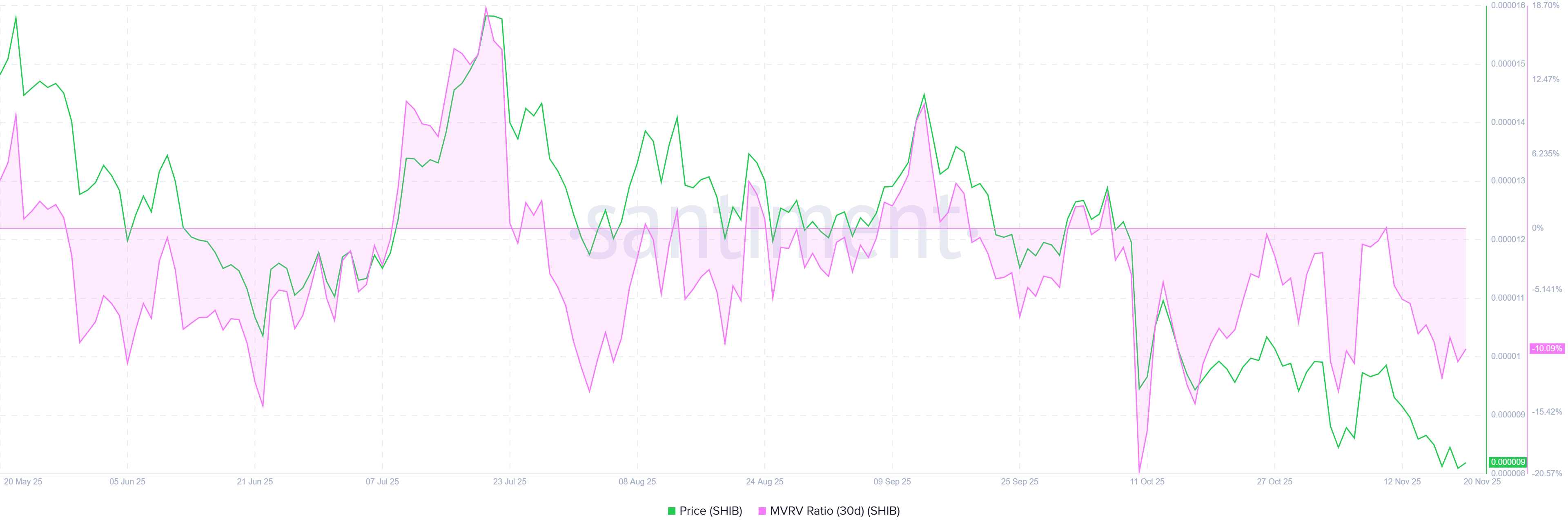 Santiment’s Market Value to Realized Value (MVRV) metric is used to identify whether a token is undervalued or overvalued in a given time frame. The 30-day MVRV ratio for SHIB read negative 10.09% on Thursday. This means that SHIB is currently undervalued. The negative MVRV values also could be interpreted as a buy signal, likely increasing buying pressure on the token across crypto exchanges. Historically, when MVRV has dropped to similar levels, the SHIB price has often recovered.