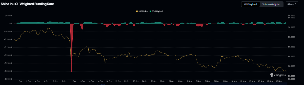 Apart from the undervalued conditions, the derivatives data also support a recovery rally for Shiba Inu. Coinglass’s OI-Weighted Funding Rate data shows that the number of traders betting that the price of SHIB will slide further is lower than those anticipating a price increase.