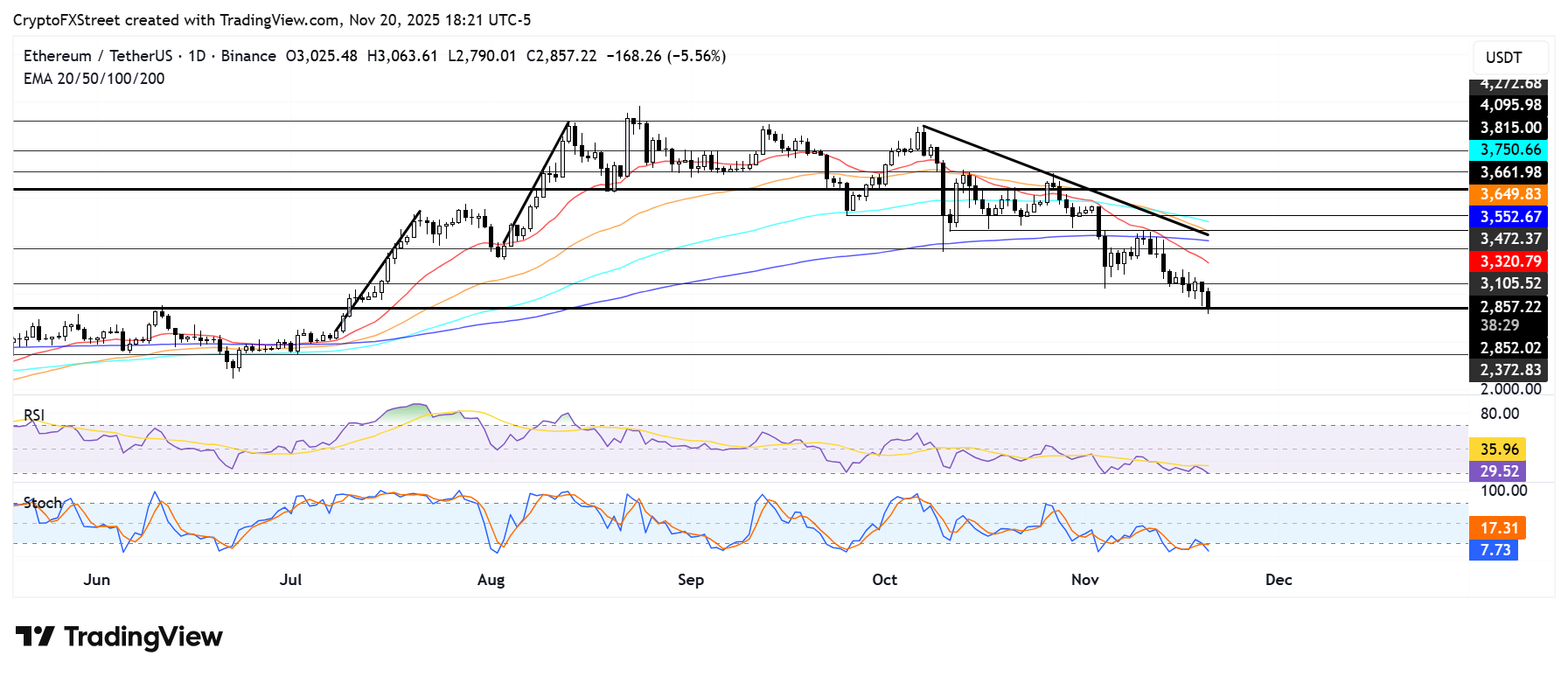 ETH is facing intense pressure at the support near $2,850 as the crypto market extended its downtrend on Thursday. A firm decline below $2,850 could send ETH toward the support level near $2,300.