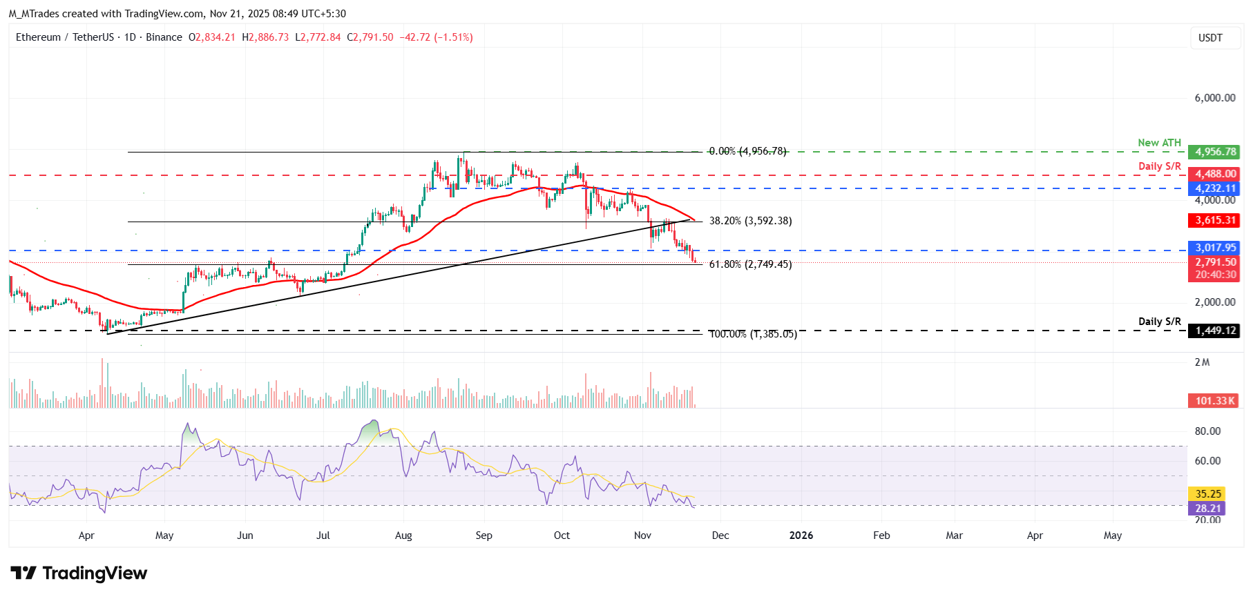 Ethereum price faced rejection at the previous broken trendline around $3,592 last week and declined by nearly 14%. ETH continued its correction, down 9.38% by Thursday, and closed below the key support at $3,017. At the time of writing on Friday, ETH continues its correction, trading below $2,791.