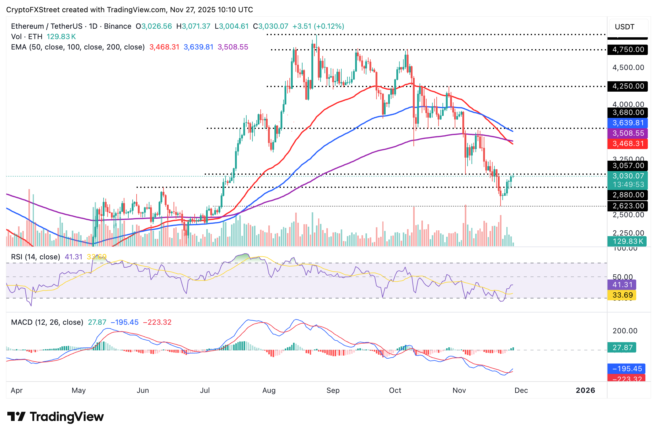 Ethereum is holding above $3,000 at the time of writing on Thursday, as bulls push to reclaim control. The RSI has risen to 41 from the oversold region on the daily chart, indicating that bearish momentum is narrowing and that ETH bulls could push toward the 50-day EMA at $3,468.