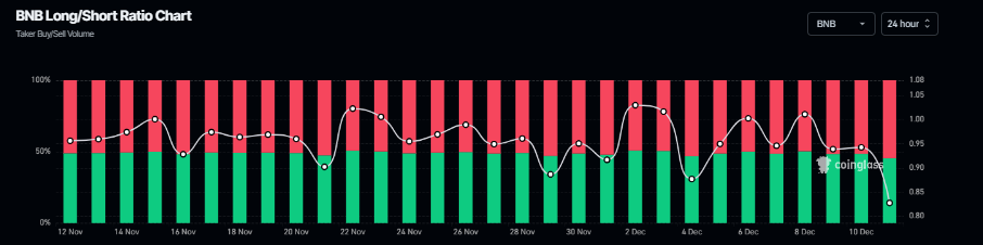 According to Coinglass data, BNB’s long-to-short ratio reads 0.82 on Thursday. This ratio, below one, reflects bearish sentiment in the markets, as more traders are betting on the asset price to fall.