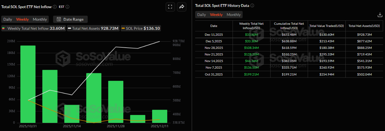 The institutional demand for SOL continues to grow since its launch on October 28. SoSoValue data shows that spot Solana ETFs have recorded positive net inflows every week since their launch, with total net assets reaching $907.18 million on Monday. This persistent ETF inflow, despite recent price consolidation, suggests institutions are buying dips rather than exiting positions, signaling a bullish outlook for SOL.
