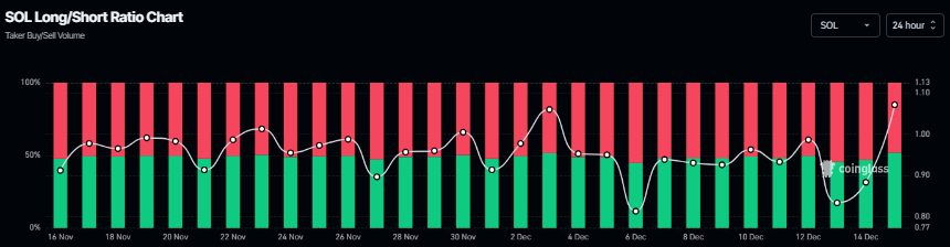 On the derivatives side, CoinGlass’s long-to-short ratio for SOL reads 1.07, the highest level in over a month. The ratio above one suggests bullish sentiment in the market, as traders are betting on the asset price to rally.