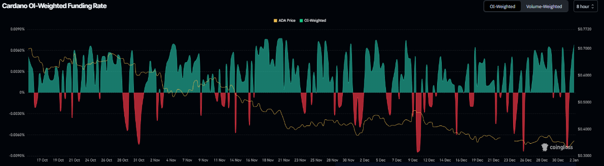 Cardano (ADA) kicks off the New Year on a positive note and is extending gains, trading above $0.36 at the time of writing on Friday. Improving on-chain and derivatives data point to growing bullish interest, while the technical outlook keeps an upside breakout in focus.