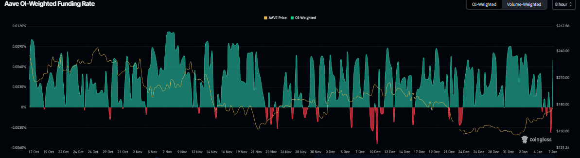On the derivatives side, AAVE’s funding rate data also hints at a bullish bias. Coinglass’s OI-Weighted Funding Rate data shows that the number of traders betting that the price of Aave will slide further is lower than those anticipating a price increase.