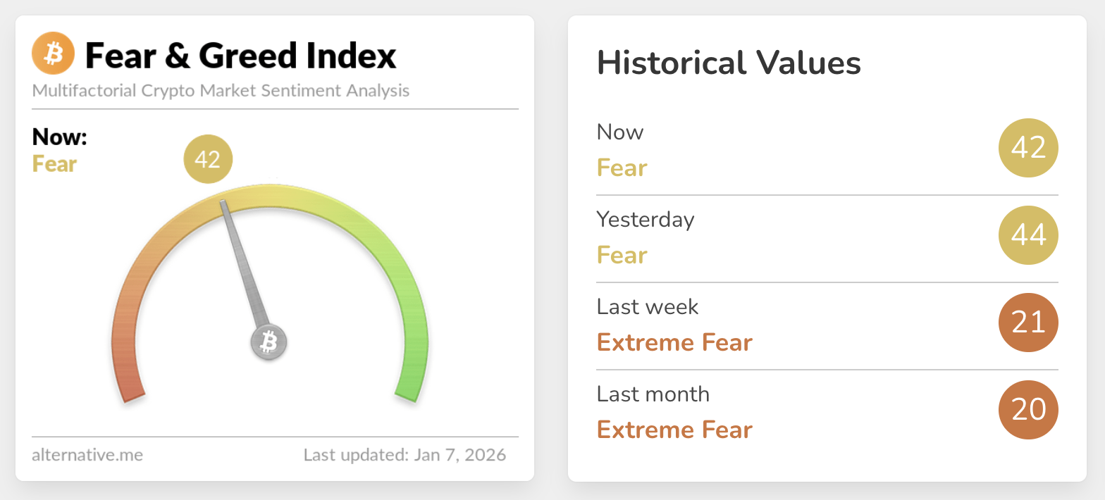 The Crypto Fear & Greed Index is at 42, highlighting a sticky fear sentiment in the broader cryptocurrency market despite improving from extreme fear last week, according to data by Alternative. Positive sentiment remains critical for steady price increases, while fear suggests uncertainty and lack of confidence in the broader trend.