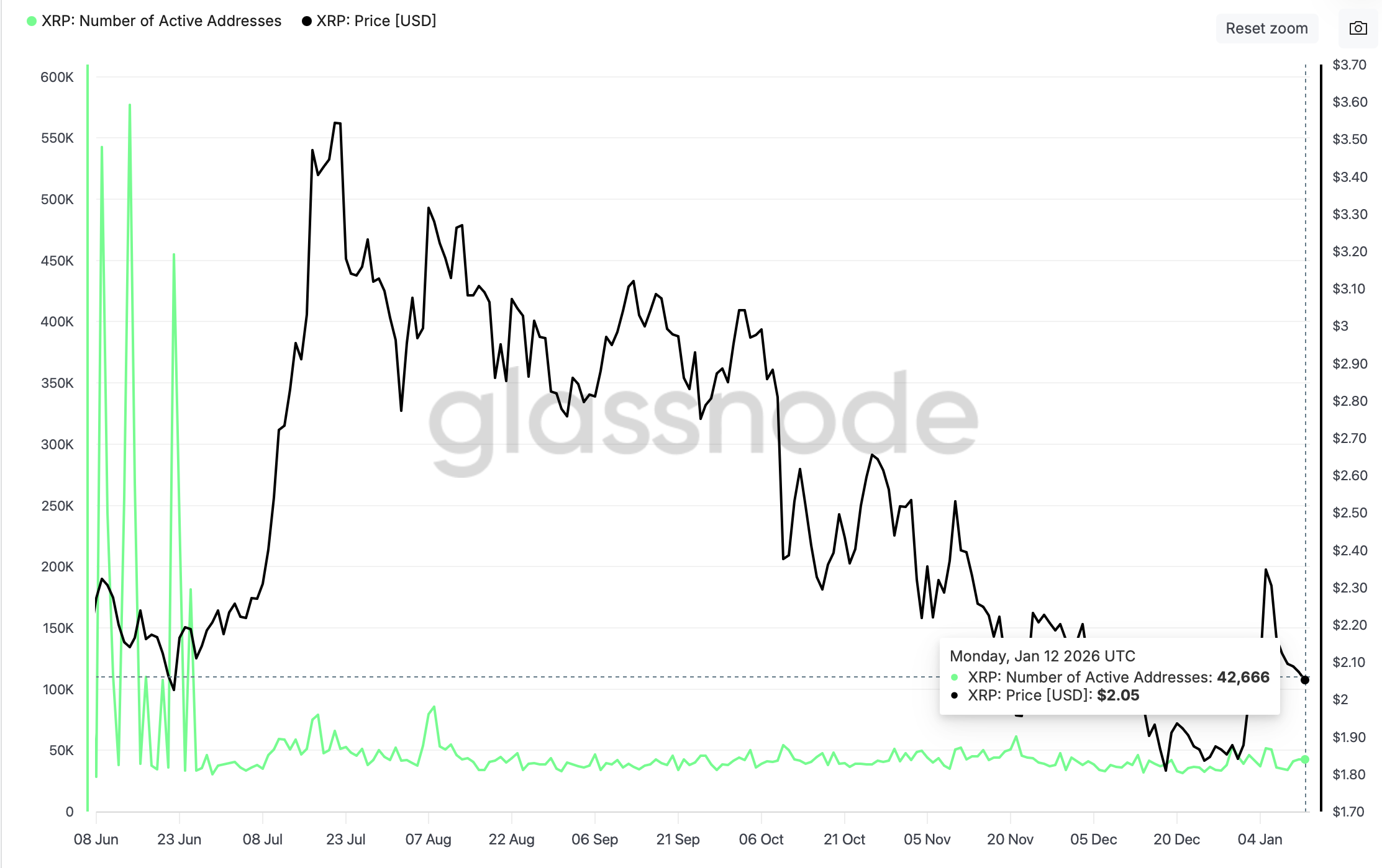 The number of addresses actively transacting on the XRP Ledger (XRPL) has declined by 17.5% to approximately 42,600 as of Monday from 51,500 recorded on January 5, according to Glassnode’s data.