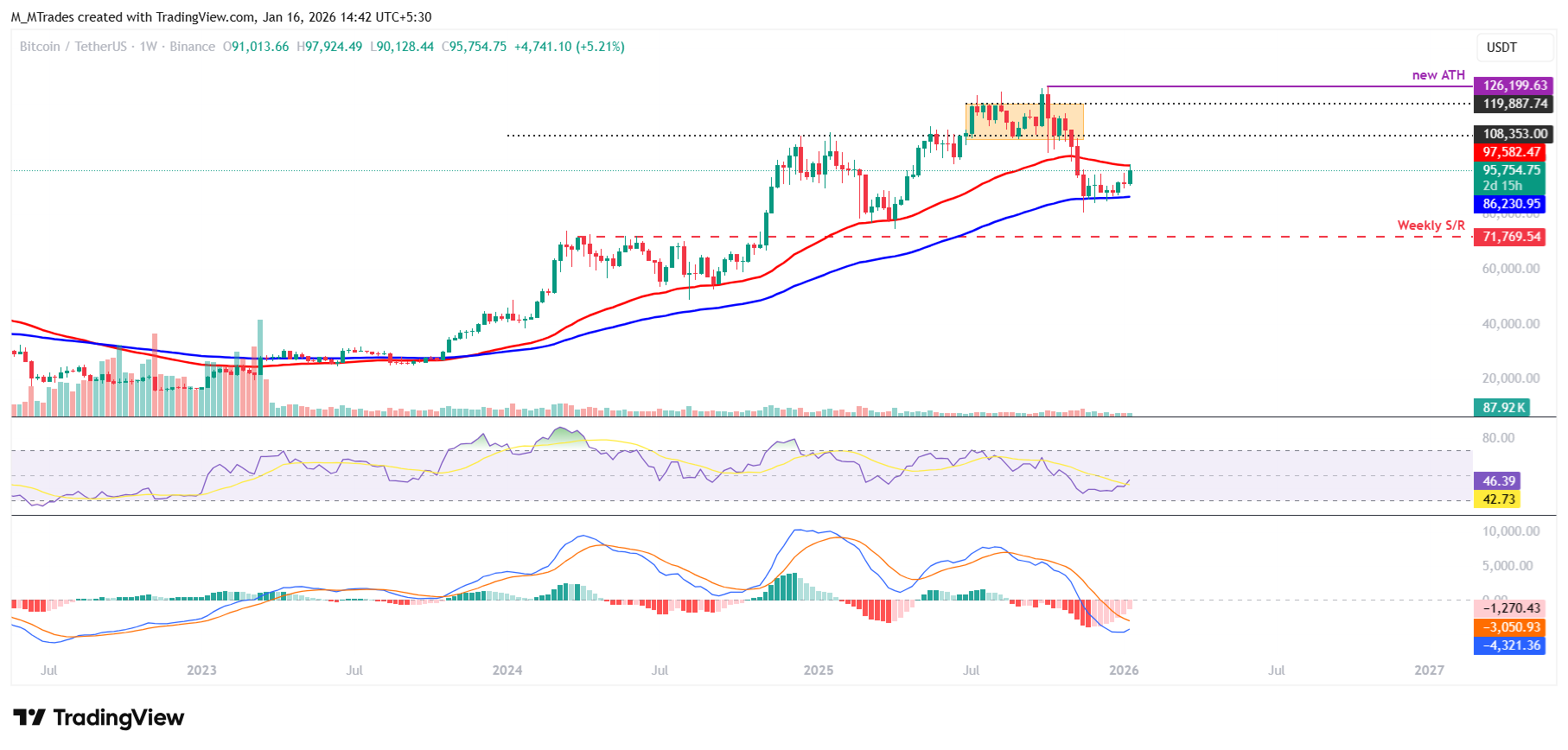 Bitcoin’s weekly chart shows the price has been holding above the 100-week Exponential Moving Average (EMA) since the end of November. As of this week, BTC rises 5%, nearing the 50-week EMA at $97,582, which is acting as immediate resistance.