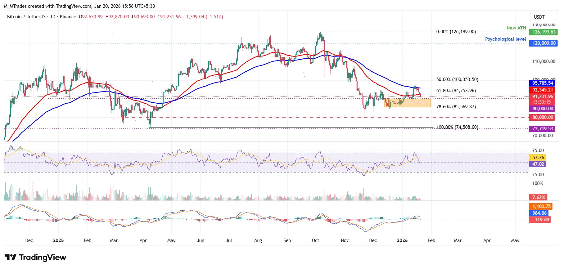 Bitcoin (BTC) price extends losses, trading below $91,000 at the time of writing on Tuesday amid escalating geopolitical tensions over Greenland. Investors are moving toward safe-haven assets, with Gold (XAU) hitting fresh all-time highs, while BTC continues to nosedive. The technical outlook for the Crypto King suggests a deeper correction ahead, with momentum indicators signaling early bearish signs.