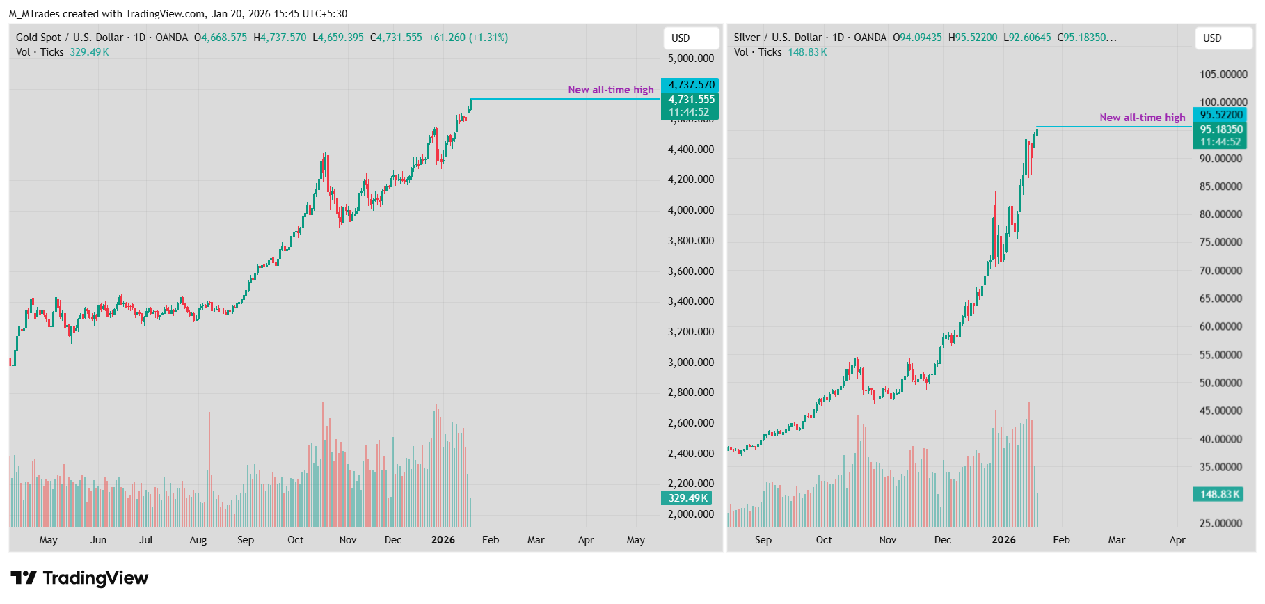 These comments added to broader geopolitical unease, prompting investors to move toward safe-haven assets such as Gold (XAU) and Silver (XAG), whose prices hit fresh all-time highs (ATHs) of $4,737.57 and $95.22, respectively, as shown in the chart below.