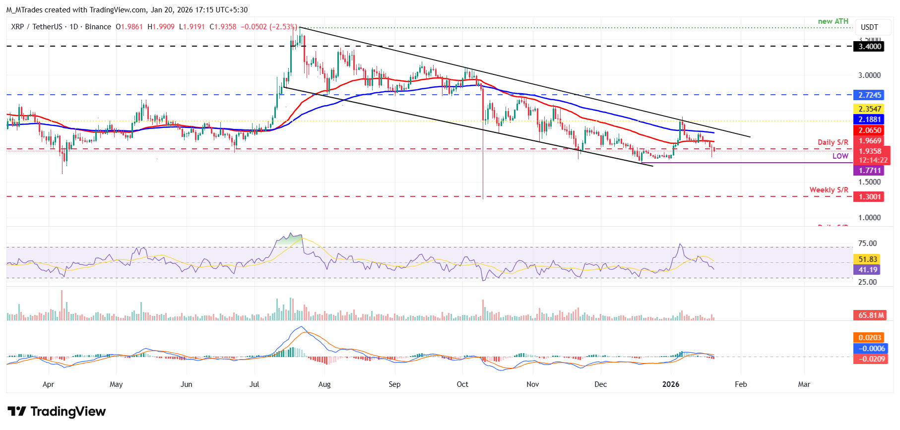 • XRP is sliding below its daily support at $1.96, risking a deeper correction.