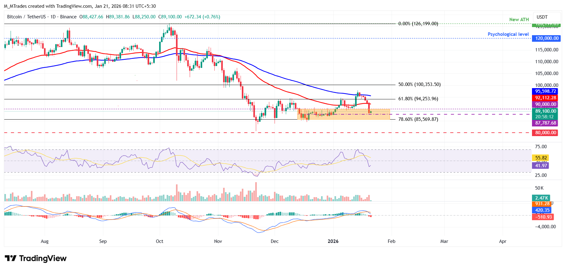 If BTC continues its correction and closes below the immediate support at $87,787, it could extend the fall toward the lower consolidation boundary at $85,569, which coincides with the 78.60% Fibonacci retracement level.