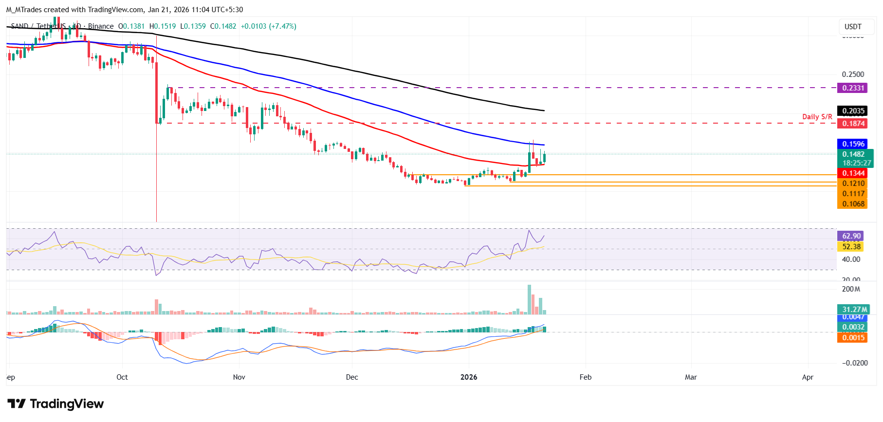 However, if SAND faces a correction, it could extend the decline toward the 50-day EMA at $0.134.
