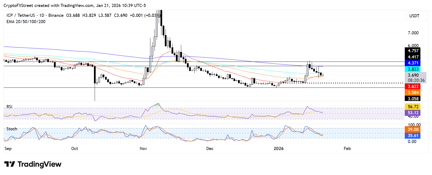 Internet Computer (ICP) is struggling to hold the convergence of the 20-day and 50-day Exponential Moving Averages (EMAs) as support. The move comes after seeing a sharp decline following a rejection at the resistance near $4.41, which is strengthened by the 200-day EMA.