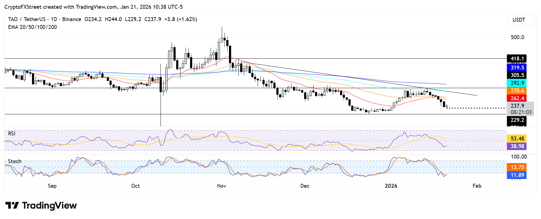 TAO could test a descending trendline extending from November 8, if it holds the $230 level and climbs above the 50-day EMA. However, a breach of the level could see it decline to find support at $206.