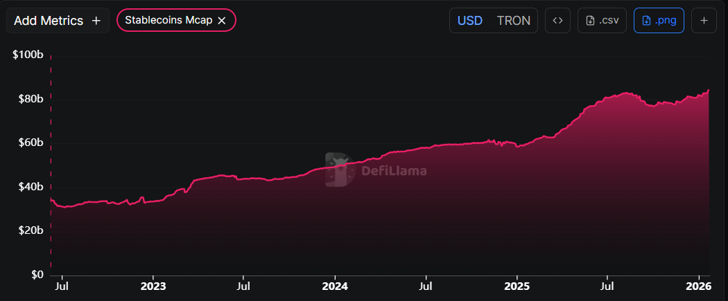 DefiLama data shows that TRX’s stablecoin total supply has risen since the end of December, reaching a new record high of $84.63 billion on Wednesday and steadying around $84.43 billion on Friday. Such stablecoin activity and value increase on the Tron project indicate a bullish outlook, as they boost network usage and can attract more users to the ecosystem.