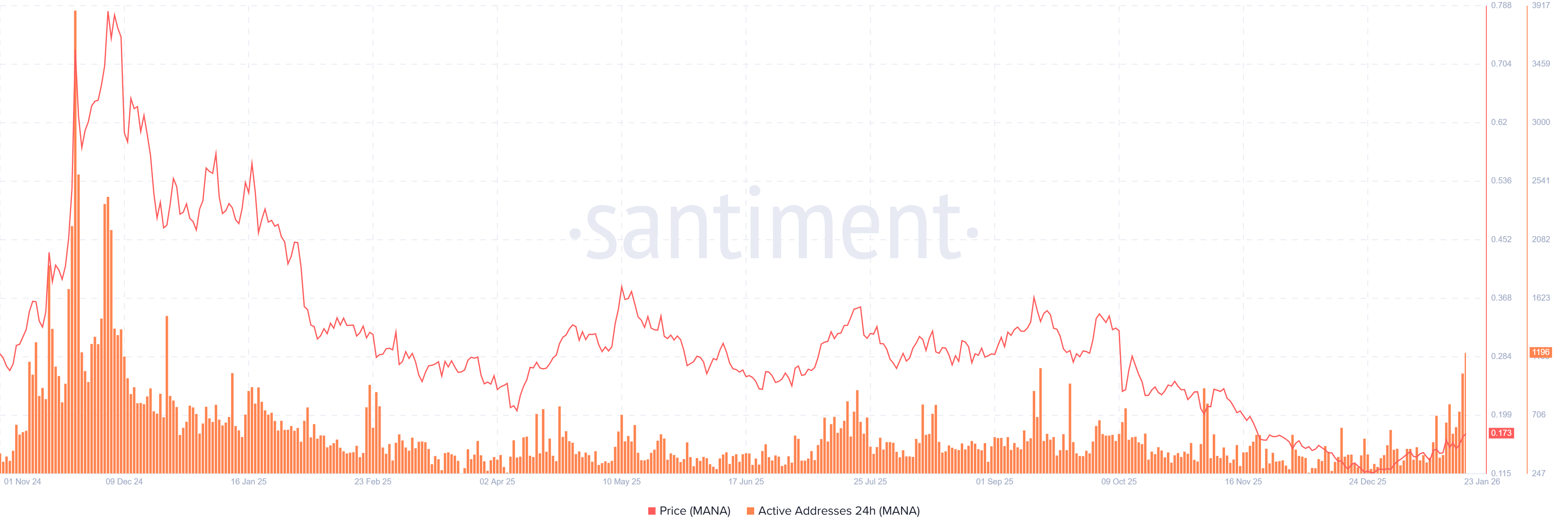 Decentraland daily active addresses chart. Source: Santiment